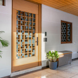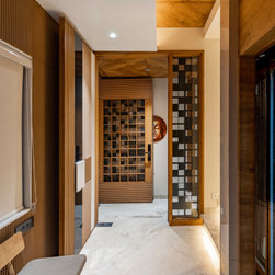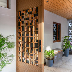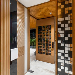 ???? ???? & ????? ????: In continuation with Jali wall pattern, the grill door and main door are beautified with Fluted panels, CNC Cut Work, Corian, and black colored back-painted glass.