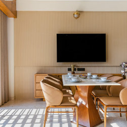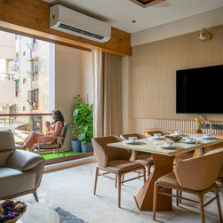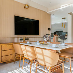 ?????? ????: The dining area is directly connected with the Drawing Room, Balcony and the Kitchen which makes the user easy to communicate anywhere in the Space. The Italian marble dining top and the beige leather chairs adds luxury to the space. The beige-colored Fluted Panels on the TV wall act as a backdrop for Dining.