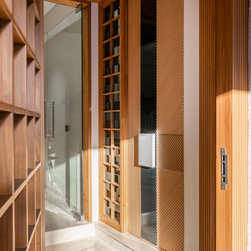 ????? ????: In this suite room, leather finished Fluted Panels has been used as backdrop of beige colored leather pleated bed. A camouflaged door to the large size dress and toilet gives a seamless and clutter-free look to the wall. This bedroom is attached with the main terrace garden. The large sized DGU reflective sliding glass doors in this house, maintains the privacy of the user. Also, it fetches the natural light throughout the day. For the safety purpose, we have provided the Sliding Grills along with the sliding glass shutters.