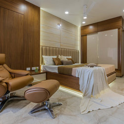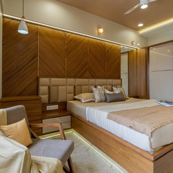 Master bedroom is defined with soothing tones and clean design. Being the oldest generation, the room has been designed in a way that will suit user’s preferences, also keeping overall aesthetics of the apartment. The toilet door has been camouflaged with the backdrop wall of bed in veneer...