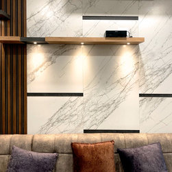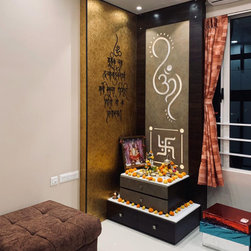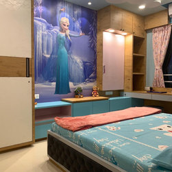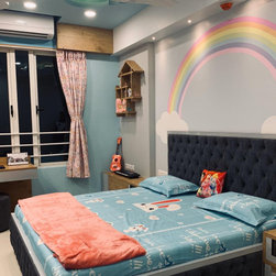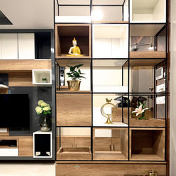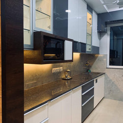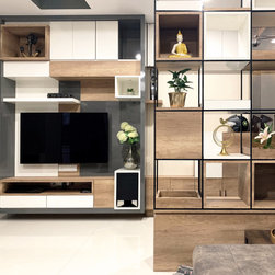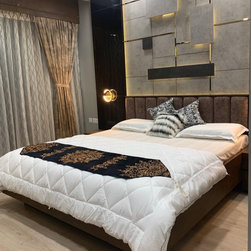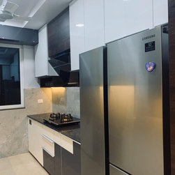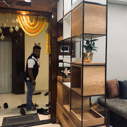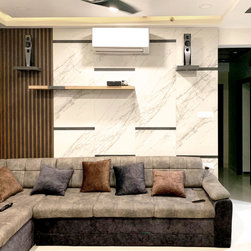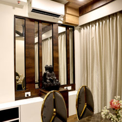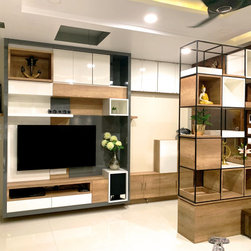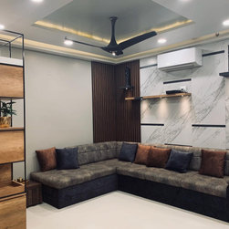 The small 3BHK apartment embraces the contemporary design with a twist - Stepping out of the stark minimalistic style of contemporary architecture and interior. We wanted to create a modern shelter with all updated technologies and amenities. Engulfed by wooden -mirror cladding on ceiling, the family living room acts as a cozy entertainment room for the family members. Entering into the spacious living room that smoothly transitions into the dining area. The space is minimal, but there's no design void that someone would want to fill. Everything fits in like a perfectly put together jigsaw.
