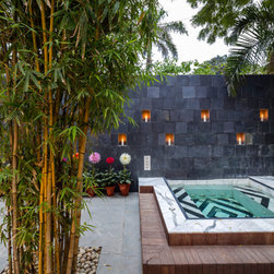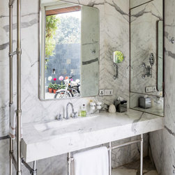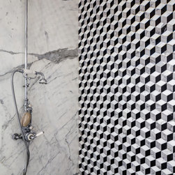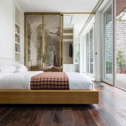 The garden facing the bedroom was enclosed to create a private step-out that houses a custom-designed marble Jacuzzi. The walk-in closet and the ensuite bathroom, also enjoy views to the private garden, and are separated from the bedroom by an intricate brass art deco-inspired screen. The bathroom is clad in Statuario marble with a custom-designed vanity carved in a block of white Statuario with customised chrome fixtures. The shower sits as an insert adorned with a monochromatic marble inlay in a geometric pattern.