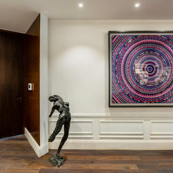 The space was conceived as a non-descript backdrop to house all the crafted inserts and the art. The few external civil walls were clad in half-cut brick and all the surfaces were painted white. Three exposed ISMB columns in the space were flamed and lacquered to add some industrial character. The client wished to keep the palette simple, with subtle art deco details and industrial elements to create contrast. Saw-cut wooden flooring, white on white panelling and delicate brass accents, all add warmth and richness to the space.