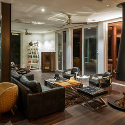 Surrounded by beautiful landscaped gardens, the single-storey structure was built in metal with a lightweight roof and glazed on three sides. The client wished to retain the uninterrupted views of the greens while still allowing him privacy when he chose it. In order to achieve this, the existing glazing system of uPVC sliding doors was retained. Additionally, the existing office entrance through a slatted wooden portal was also retained as the main entrance to the house. This guided the zoning of the interior space.
