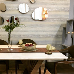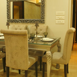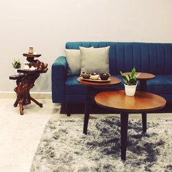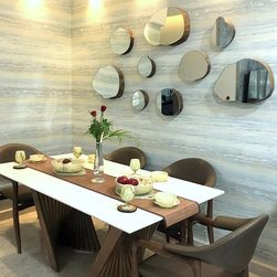 Site 2: The living room in itself showcases an array of elements. The wooden element was first introduced with their pre-owned tree bark coffee table that was restored and reused on our recommendation in harmony with the jagged mirrors above the dining table.