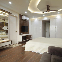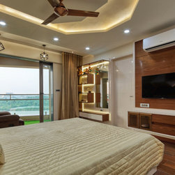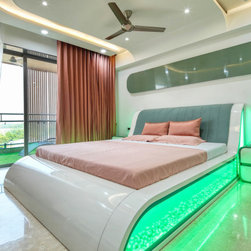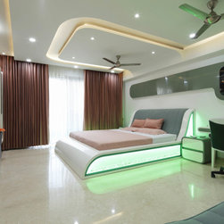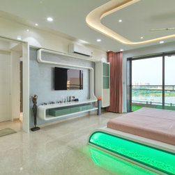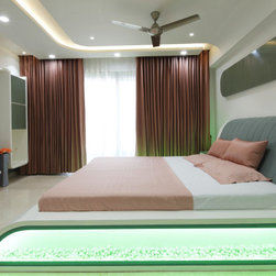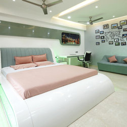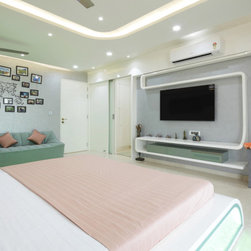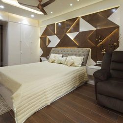 The Parent's room, designed in the theme of India, is an elegant contrast of Dark & Light. The dark tones being of the floor tiles and wall Veneer complimenting with lighter tones of white walls & wood polish, along with geometrical shaped bed back paneling and ceiling with diffused lighting, gives the room touch of vibrancy along with cozy and elegant luxury. The decor items, i.e. Golden temple wall frame, Rajasthani Folk singers, the Taj Mahal, etc. symbolize the varied and rich cultures of India.