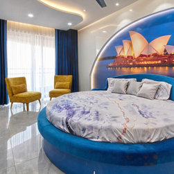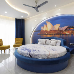 The Guest room designed in theme of Australia gives glamour to the house. Circular Bed with similar sized circular ceiling and curved bed back wall paneling with the wallpaper of Sydney Opera house, make the theme more visually appealing. The prime colours are the Blue and White, in wood polish, wall paint and fabric textures, contrast subtly with the Mustard yellow lounge chairs. The basin wall mirror in ensuite is also laser cut in shape of Australia to add to the theme.