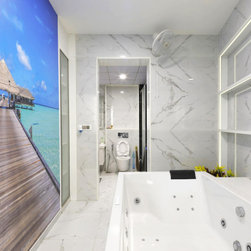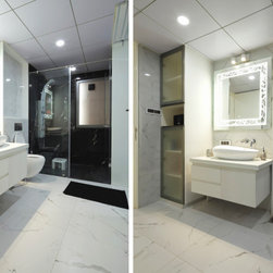The Ensuite is in full white marble finish walls & floors, the Shower area in black for contrast. The eye-catcher here is the mirror, laser cut design with LED back-lit enhances the function. The way from ensuite leads to a full white Jacuzzi room with a tub in white too, facing a LED frame Tv and a beach resort wallpaper to give the feel of a sublime vacation in one's own home.