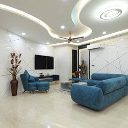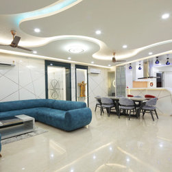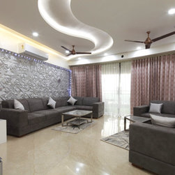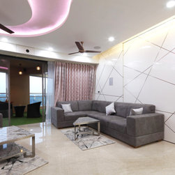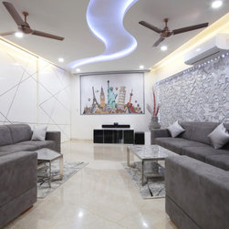 Drawing room, which also converts to a Home theatre, merely by uttering a few words (controlled by Alexa & Automation), is set in the theme of World. All prominent structures of the world set a pastel coloured collage on wall with Projector screen above which rolls down as required. The Sofas with flexible backs serve both purpose of Drawing room and Theatre comfort. Subtle yet rich fabrics, wall textures, mildly vibrant stone wall cladding and the ceiling curves' theme, make Drawing room a Contemporary luxurious room to be in.