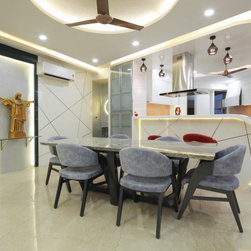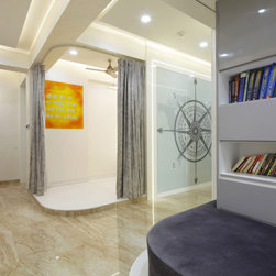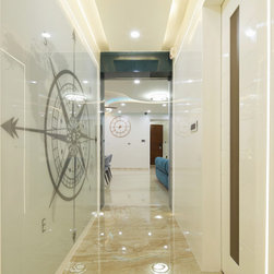 The house is divided into two major zones, the common and the private areas. Common being the Entry foyer, Drawing & Balcony, Living, Dining and Kitchen, which are open planned. The private areas are mainly the Bedrooms, along with Puja & Library area. These two zones are connected via a passage, which being bit narrow as compared to the rest of the house, is thus designed with full wall digital printed Glass, denoting a huge Compass, giving it the theme of World, added with Led profile lights for extra glow. The passage has the Puja on one side and a Library & reading space on another. All religious faiths have their space here, i.e. Digital glass printed photo of the Guruji & Gayatri Mantra in the Puja, a frame of Mahavir Swami on one wall and frame of Judaism & Islam on another. A Globe & a Sailing ship add to the theme of Travel.