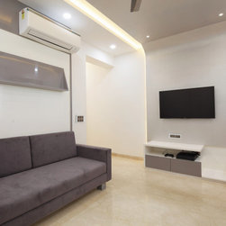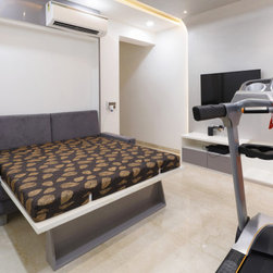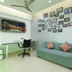 The Activity cum future Kids' room is designed in theme of Antarctica. The current use to exercise and play could easily turn into a Bedroom via a wall collapsible Bed. Subtle wall textures contrast with the vibrant wallpapers used, which can be easily changed with the Kid growing up. The ensuite also has a basin wall mirror cut in shape of Mickey mouse with a digital glass print Penguin family completing the theme.