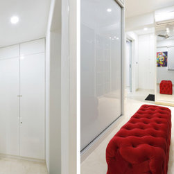 The walk-in wardrobe is mostly White, continues the Contemporary American theme and also enables the room look bigger. The Dressing wardrobe has translucent glass shutters for Coats, bags, shoes & other accessories, which were desired to be seen partially both for the looks and function. The main wardrobes are in Wood polish and back painted glass with profile shutters, also in white theme, with a Red tufted Puffy couch and a vibrant poster of Marilyn Monroe as a contrasting American symbolism.