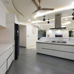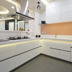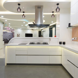 Kitchen designed in theme of Europe, is mainly White, with combination of a Glass band in Peach tone and small parts of deep Red in cabinets. Raised bar-platform designed in curves with diffused lights below complement with pendant and diffused ceiling lights above, in varied Hue tones (also controlled by voice automation). Red bar chairs act as cherries on the cake. The different technical materials, i.e. German DuPont Corian breakfast counter, which enables it to curve and bend as desired, the imported Quartz counter tops, German & Italian hardware used, Italian appliances, etc. along with decor of Eiffel tower wallpaper and little decor of French Chef, leaning tower of Pisa, give the feel of being in Europe.