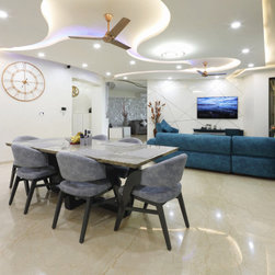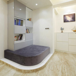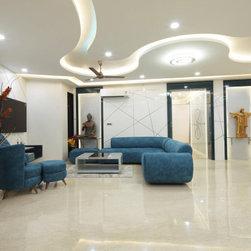 All the furniture is made on site or in local workshops, to fulfill the client’s requirements of custom shapes, colour choices and combination of materials. The Lounger & Modular Sofas, Statement chair, Metal+Stone and Wood+Glass center tables in Living & Drawing, Brazillian granite top Dining table & chairs, Corian top breakfast unit, the circular Bed in Guest room, the Pebble Bed in Master bedroom, etc. are all bespoke, designed as per the taste and detailed inputs from the clients.