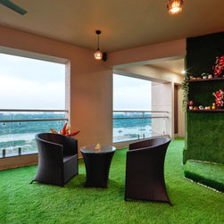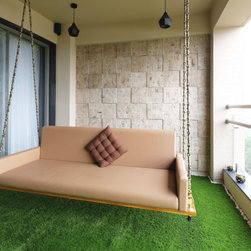 Balcony, which is the main area in the house to interact with nature, primly as this being a Riverfront area, is designed in theme of Africa. A Swing along with Coffee chairs & teapoy are the only furniture required. The wall behind Swing is clad in Stones carved in ancient Egyptian style cave paintings. The wall opposite is created as a Vertical wall with small animals denoting the Amazon Rainforest with its rich flora and fauna, with the Pyramid table piece to symbolize the golden age of Africa.
