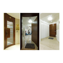 The Entrance foyer, to balance the dark brown of the Veneer tone outside, is kept White in order to enter the home in serenity. Vertical groove patterns on the side wall camouflage, door to Powder room and main Electrical distribution boards, which would disturb the theme otherwise.