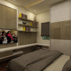 TV Unit with Continuous Study and Storage | Wardrobe with High Gloss Finish Laminate | Roman Blinds on Windows |