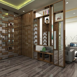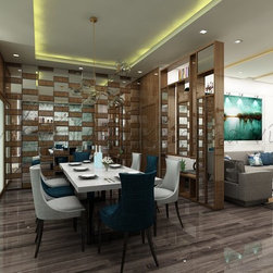Dining designed wit mirror and veneer design wall | Partition with glass and space for storage and lights | Hanging Pendant light on the dining table |