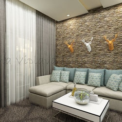 Wall Cladding on accent walls | Animal head decor | L- Shape Sofa | Complete Rug Flooring |