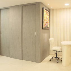 In the small office there is a pantry space and a toilet. The doors to the pantry and toilet are overlapping sliding shutters to save on space and have lesser visitble members