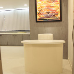 Small space that incorporates everything from a seating, to reception, to a large work table.