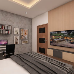 Bedroom with study corner and storage for book shelf | T.V Unit with wall Paper as background |
