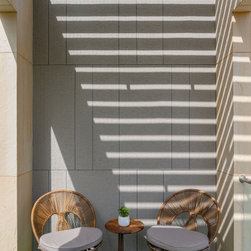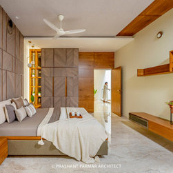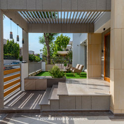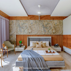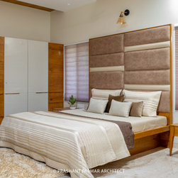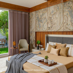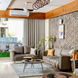 A soothing combination of wood veneer, PU & beige colored fabric in the headboard of the Master Bedroom enhances the minimalism of the space. A semi-covered elevated garden with pergolas makes the space more interesting. Furthermore, the wooden figured grey MCM panels with mirror panels & decorative lights amplify the magnificence of the daughter’s bedroom.
