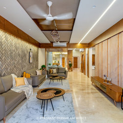 On the East of this 2,600 sq. ft. plot, lies a narrow road in the front, a common wall on the South that blocked Wind & Natural Light. This created worries in the mind of the client. Also, the plot is surrounded by neighboring bungalows with very less margins. But the experience and the expertise of the architect broke all the hurdles and created an exemplary Bungalow named “Narrow House”.