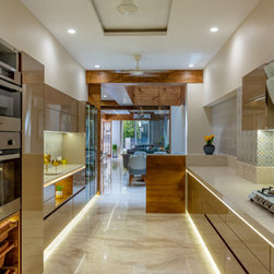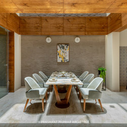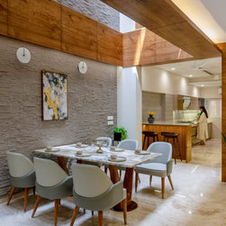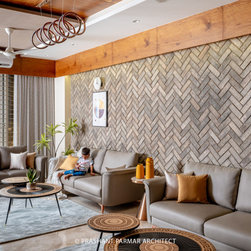 A person is warm-heartedly welcomed during the daytime by the interesting drama of light & shadow created by the MS pergolas on the entry steps & otta. The grandeur of the Drawing Room is experienced by the huge 25’ long wall highlighted with burnt brick cladding in a herringbone pattern as a backdrop of Grey toned genuine leather sofa. The seamless flow & visual connectivity can be observed through the dining & kitchen, without any wall barriers hindering the vision.