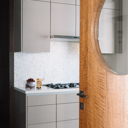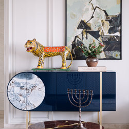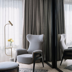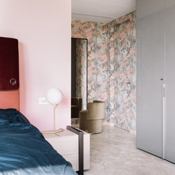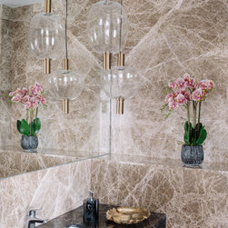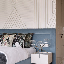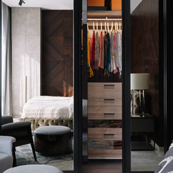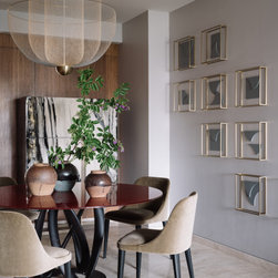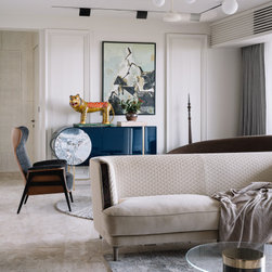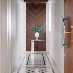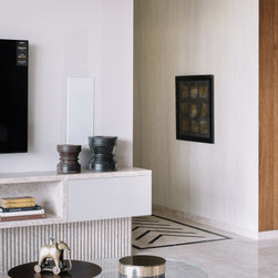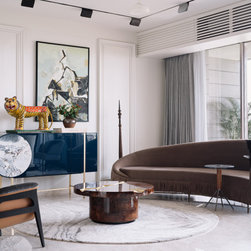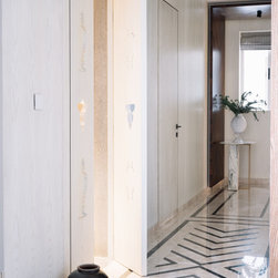 A narrow foyer passage with marble inlay design directs the movement into a widely open living, dining and four bedrooms. The doors have been flushed completely to the wall and finished with the same veneer to give the entire space a seamless and neat look. The Furniture, lights and accessories have been sourced from some of the best luxury brands from all over the world to enhance each corner perfectly. This apartment is warm and welcoming, truly a reflection of our client.