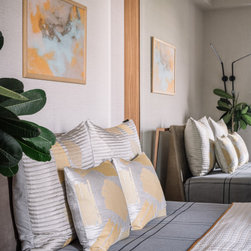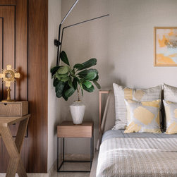 With neutral tones and straight lines setting the base, softness is added with the circular and curved shapes of a few pieces of furniture and color has been added harmoniously in different forms, patterns and textures to weave this apartment beautifully together.