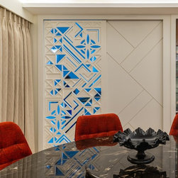 Circular dining takes the central stage between subtle furniture and latticed sliding doors. Glamour of chandelier is increased by the embossed motif on its ceiling.