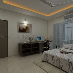 Bedroom designed with separate Study area and Book Shelf | Simple False Ceiling with rope lighting |