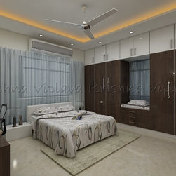 Bed designed with soft headboard and side tables | Full wall wardrobes with loft storage | Low height-ed seating with storage |
