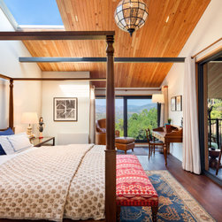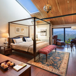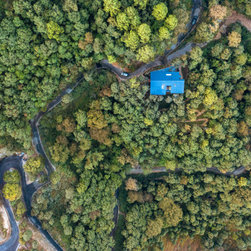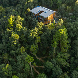 The villa is split into three levels to offer differentiated experiences and uninterrupted lines of sight. Residents enter via a wooden boardwalk into the living quarters that also comprise a kitchen and dining area. A north-facing deck and a south-facing court promote outdoor lounging with panoramic vistas of the forests beyond. The floor above hosts bedrooms featuring floor-to-ceiling bay windows and skylights that frame expansive views of the landscape and fill interior spaces with daylight. The lowermost level houses the guest bedroom, staff quarters and ancillary facilities, merging with the gradient of the slope under the canopy of native vegetation.