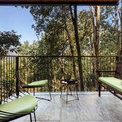 The plan for the villa follows the blueprint of nature, with each element sensitively charted out in congruence with the landscape. A dominant theme throughout is one of fluid transitions, removing the boundaries, and living with nature. Nestled amidst the dense foliage of deodar, chide, and oak trees, the villa is perched on stilts. Designed to evoke the experience of treehouse-living, the elevated structure is capped by a pitched roof and spacious balconies, offering residents solitude and direct connections with the lush outdoors.