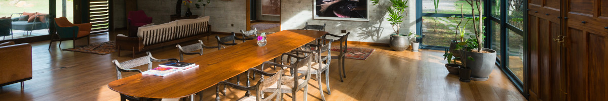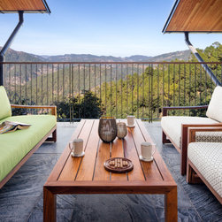 The dining area doubles up as a conservatory, which, in addition to the sliding doors, window walls, and skylights, illuminates the interiors with daylight and enables residents to stargaze at night. The sun-drenched south court is strategically located to establish a seamless inside-outside experience and maximize views of the natural setting. The material palette of timber, slate, and local stone builds on the lexicon of koti-banal architecture, endemic to the Kumaon region. The interior design scheme further underpins the experience of being cocooned in a treehouse through its use of hand-crafted woodwork that blends classic notions of a simple wood structure with modernist angles, clean lines, and contemporary design elements.