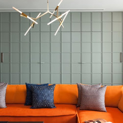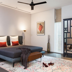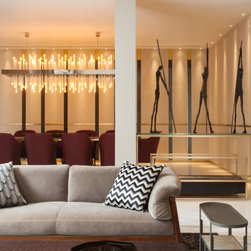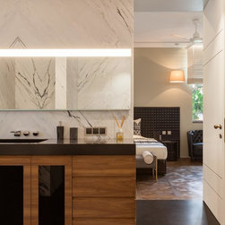 The use of stone, as flooring and wall panelling, juxtaposes contemporary interpretations of traditional techniques. Gwalior mint sandstone wall panels have been fluted and shot hammered while black and white marble inlay on walls and as flooring in the circulation areas vary from bold to simpler geometrical patterns as one moves from lower to upper levels. Sleek elements such as brass detailing and metal skirting accentuate the spaces.