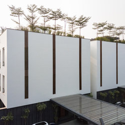 To address the challenge of screening the homes from the constant chaos of the highway, the façade was developed as a monolithic form with slim striated interludes of timber slats adding relief to its impervious geometry. The two white blocks are given gravitas by a lower edge of serrated black granite clad till ground floor height; finding echo in the solidity of the corten steel exterior boundary.