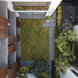 Keeping the heavy traffic of the front main road in context, the plan was recessed deeper, than usual offset norms, into the site. The setback also serves as a driveway, shared by the two houses. Given the shape of the plot, both residences follow a linear configuration with a landscaped spine clearly separating them. The spaces have largely been planned around greens to expand the inside-outside relationship. The issue of one of the houses overlooking primarily into the neighbouring property was resolved by planning it to look inwards into a large central courtyard rather than outwards. A rear lawn becomes a connecting space for both homes.
