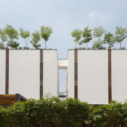 The architectural vocabulary has been kept minimal where clustered variations of timber slats lend contrast and warmth to the monochromatic mediums. The sharp geometry of forms casts a graphic play of light and shadow, animating the planes as the day courses.