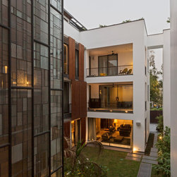 The brief was to create two independent houses in a common plot located next to a busy highway. The corner site is flanked by service roads on two sides and an adjoining residence on the third.