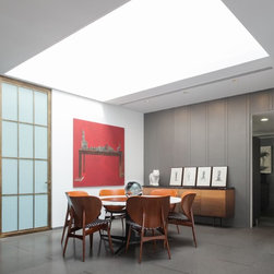 Openings are oriented to maximize the south sun. A triple volume stairway is washed by natural light, through a panel that features a combination of frosted and textured glass.