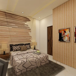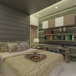 Bedroom with Wooden Plank Headboard Continues in the False Ceiling | Study area with storage|