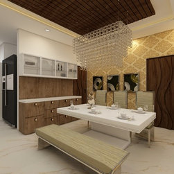 Dining designed in rich style with designer dining table and a rustic themed crockery unit | Crystal themed chandelier |