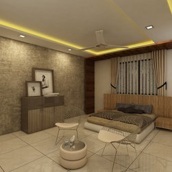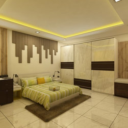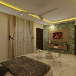 Bedroom Designed with TV Unit | TV Unit Wall Highlighted with a Wall Paper | False Ceiling Designed with Rope Lighting |