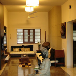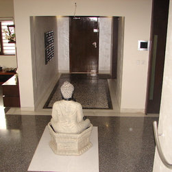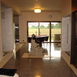 Designed the residence right from the construction space. Pictures dont do justice to the overall design since the project could never be documented properly. The common spaces revolve around the Buddha which is in the centre of a 'plus' and the four sides are the entrance, staircase, family room and dining room. Furniture was selected and brough from china and assembled in Ahmedabad.