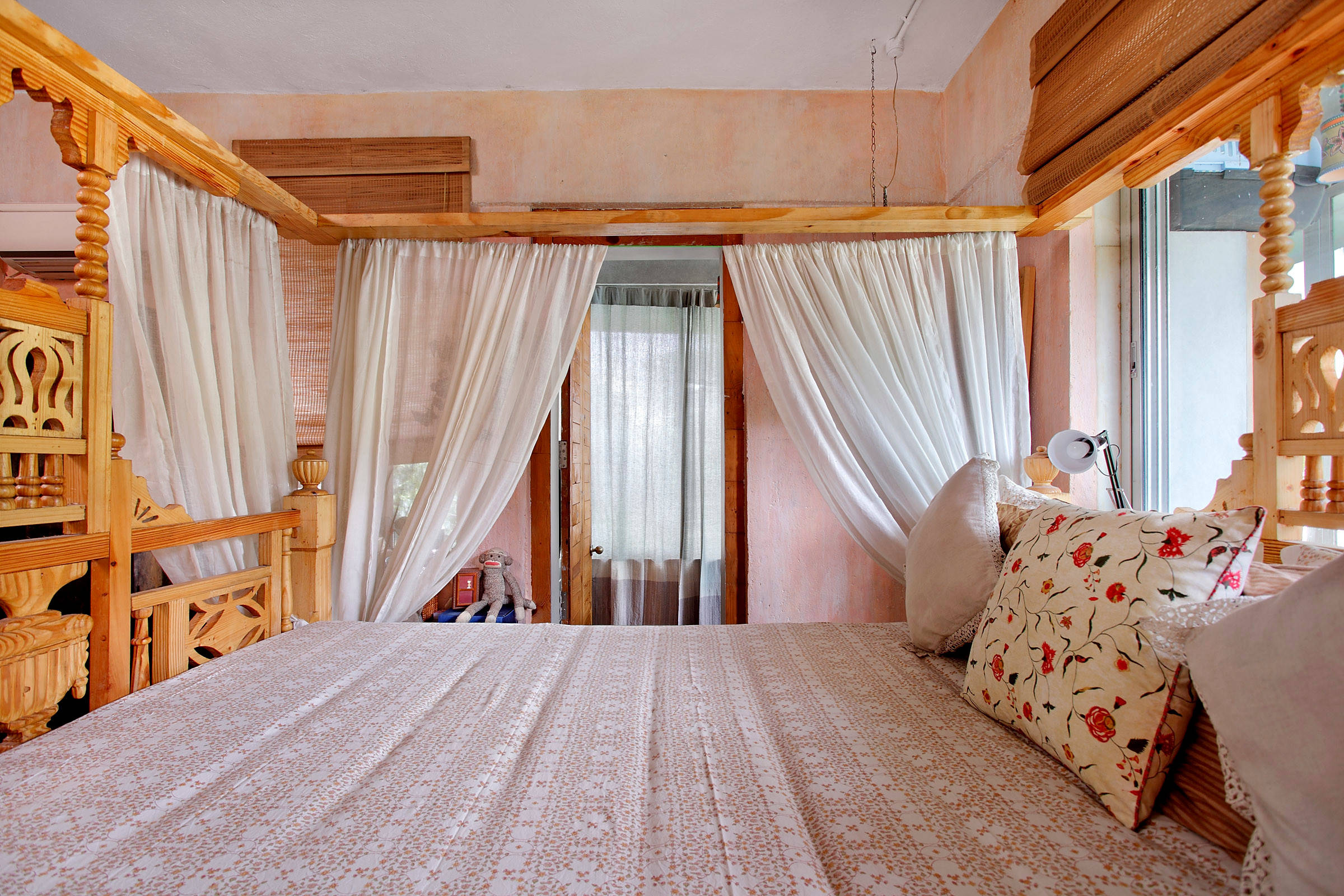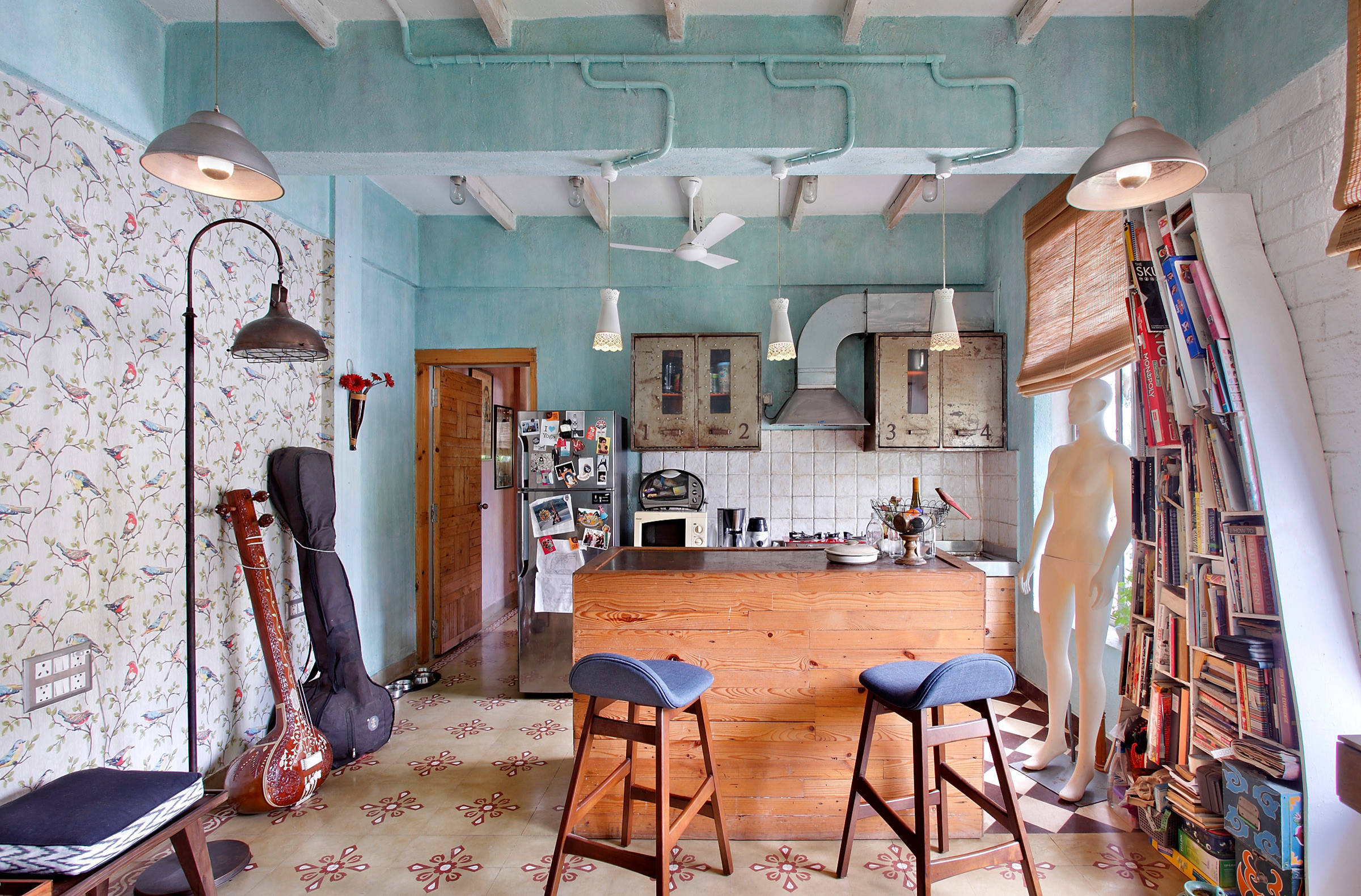 This one-bedroom apartment has a quirky, eclectic character and a snug vibe. The first small room is designed as a multipurpose space, housing living and dining spaces, a music area and a home office (thanks to a compact table and chair). The bedroom accommodates a large bed that allows for plenty of storage underneath it. A tall mirror next to the bed doubles as a dressing area. Small cabinets and tables serve as places to display art and curios.