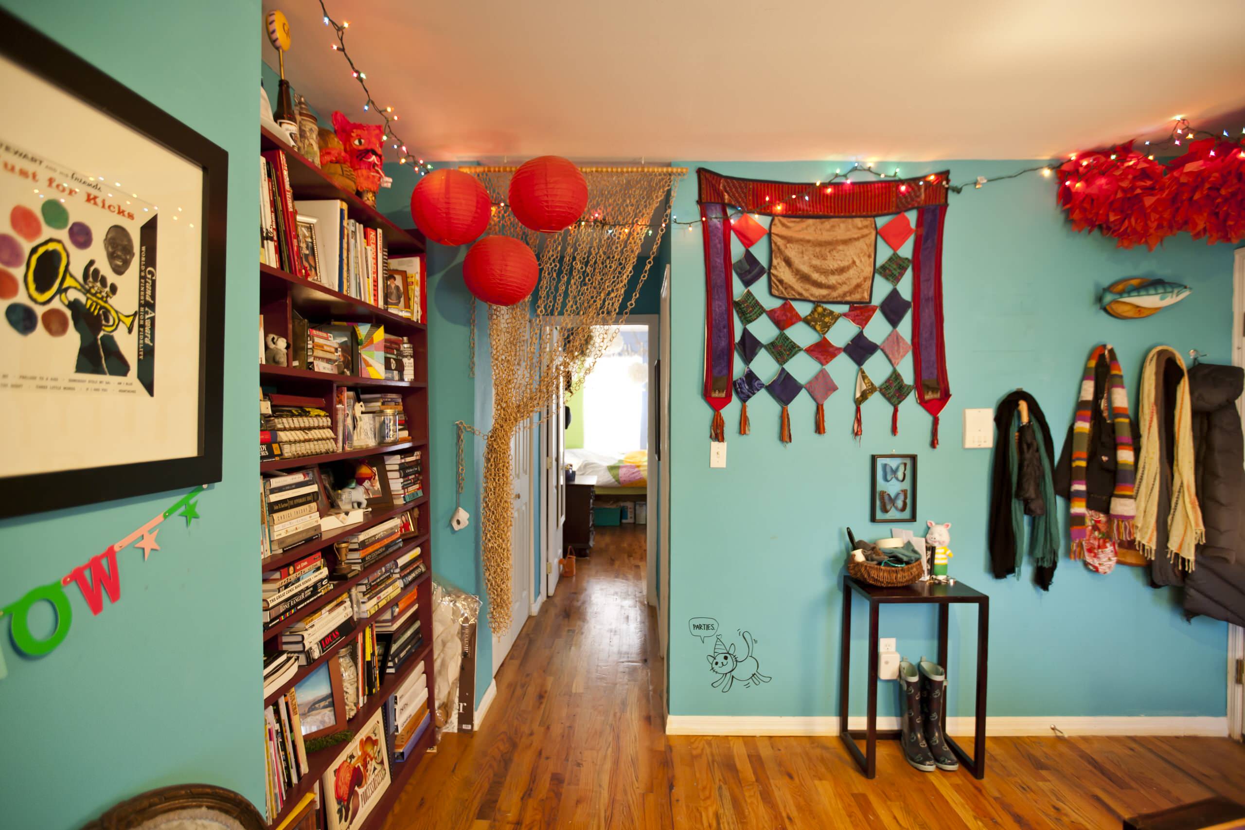 This small home’s design is a clever play with distraction. The impactful palette, fascinating art and plenty of tiny displays overcome the small square-footage of the home. The living room has a lot of art with red accents that are highlighted by the aqua walls. The small office space is filled with inspiring objects, graphic art and hand-made drawings.