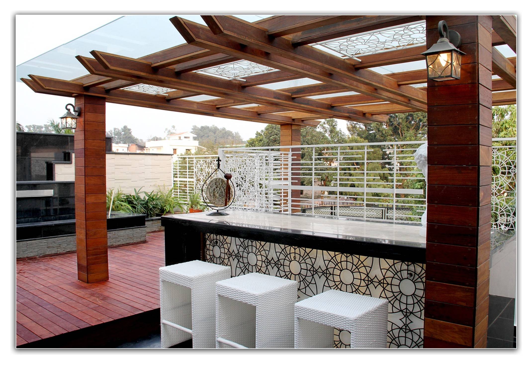 Bring in a pergola that can be used as a bar area or even an outdoor barbecue station. In this image, NA+P Architects erects a pergola with wooden support cross-beams and pillars and an etched-glass roof for a decorative touch. The glass provides good cover on rainy days and saves precious outdoor furniture.
